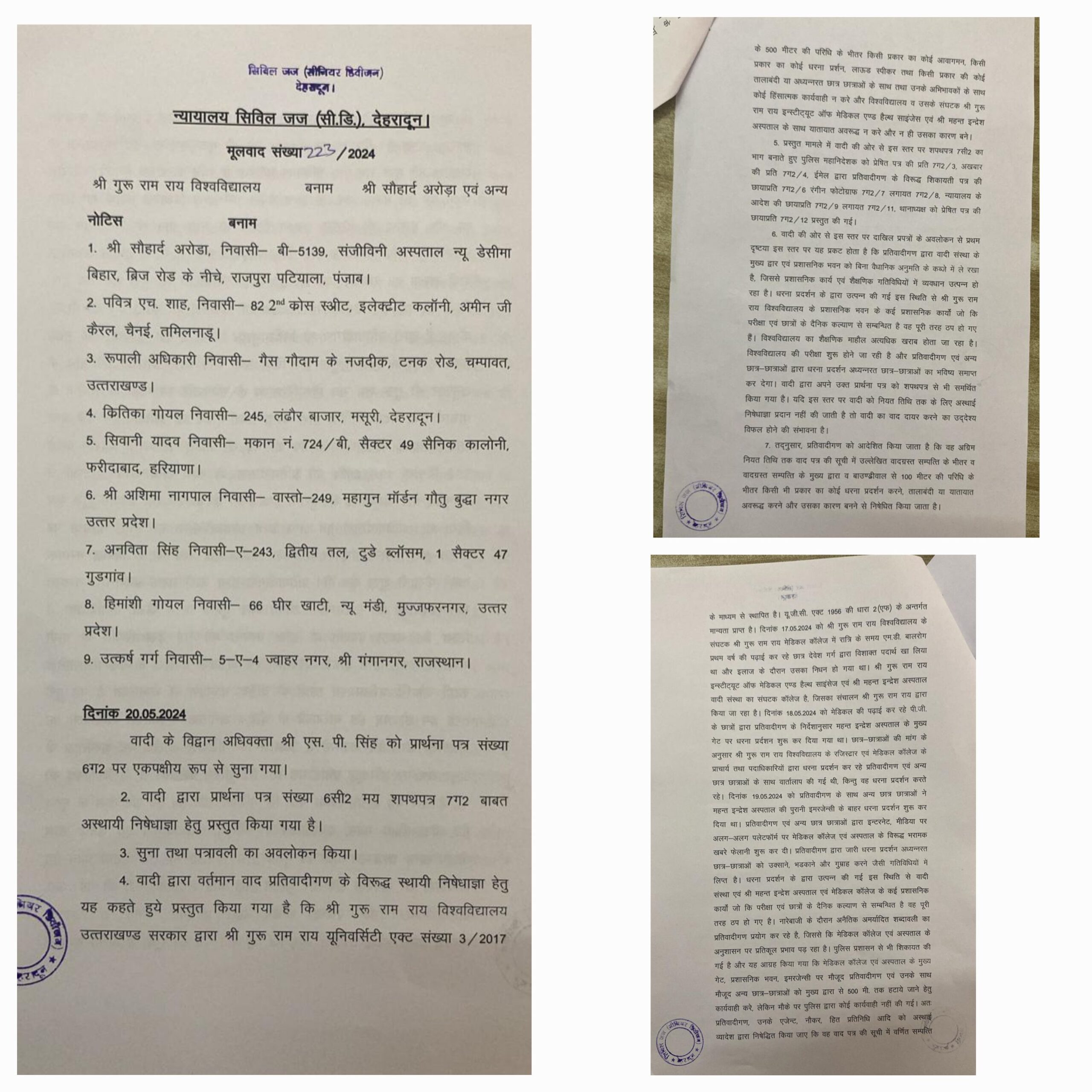 श्री गुरु राम राय इंस्टीट्यूट एवम् श्री महंत इन्दिरेश अस्पताल परिसर में धरना प्रदर्शन कर रहे मेडिकल काॅलेज के छात्रों के विरूद्ध कोर्ट ने सख्त आदेश दिए हैं। मेडिकल काॅलेज, श्री महंत इन्दिरेश अस्पताल सहित श्री गुरु राम राय विश्वविद्यालय के सभी संघटक काॅलेजों के परिसर में किसी भी प्रकार का धरना प्रदर्शन पूर्णतः निषेध रहेगा। कोई भी छात्र छात्रा या असमाजिक तत्व अस्पताल, मेडिकल काॅलेज की सेवाओं को बाधित नहीं करेगा। इससे उपचार के लिए आने वाले मरीजों को बड़ी राहत मिलेगी और किसी भी मरीज़ के उपचार में व्यवधान उत्पन नहीं होगा। साथ ही साथ किसी भी जूनियर छात्र-छात्रा को क्लास में जाने व अध्ययन करने से नहीं रोका जाएगा।