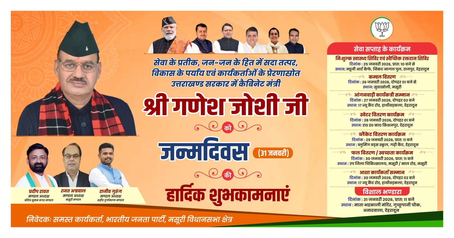 मंत्री गणेश जोशी के जन्मदिवस (31 जनवरी) के अवसर पर जनसेवा की भावना को समर्पित करते हुए “सेवा सप्ताह” के अंतर्गत आज सुवाखोली में जरूरतमंद, असहाय एवं आर्थिक रूप से कमजोर लोगों के लिए निःशुल्क कंबल वितरण कार्यक्रम का आयोजन किया गया। जिसमें नगर पालिका परिषद मसूरी की अध्यक्ष मीरा सकलानी बतौर मुख्य अतिथि सम्मिलित हुईं। कार्यक्रम के दौरान बड़ी संख्या में जरूरतमंदों को कंबल वितरित कर उन्हें शीतलहर एवं ठंड से राहत प्रदान की गई।
