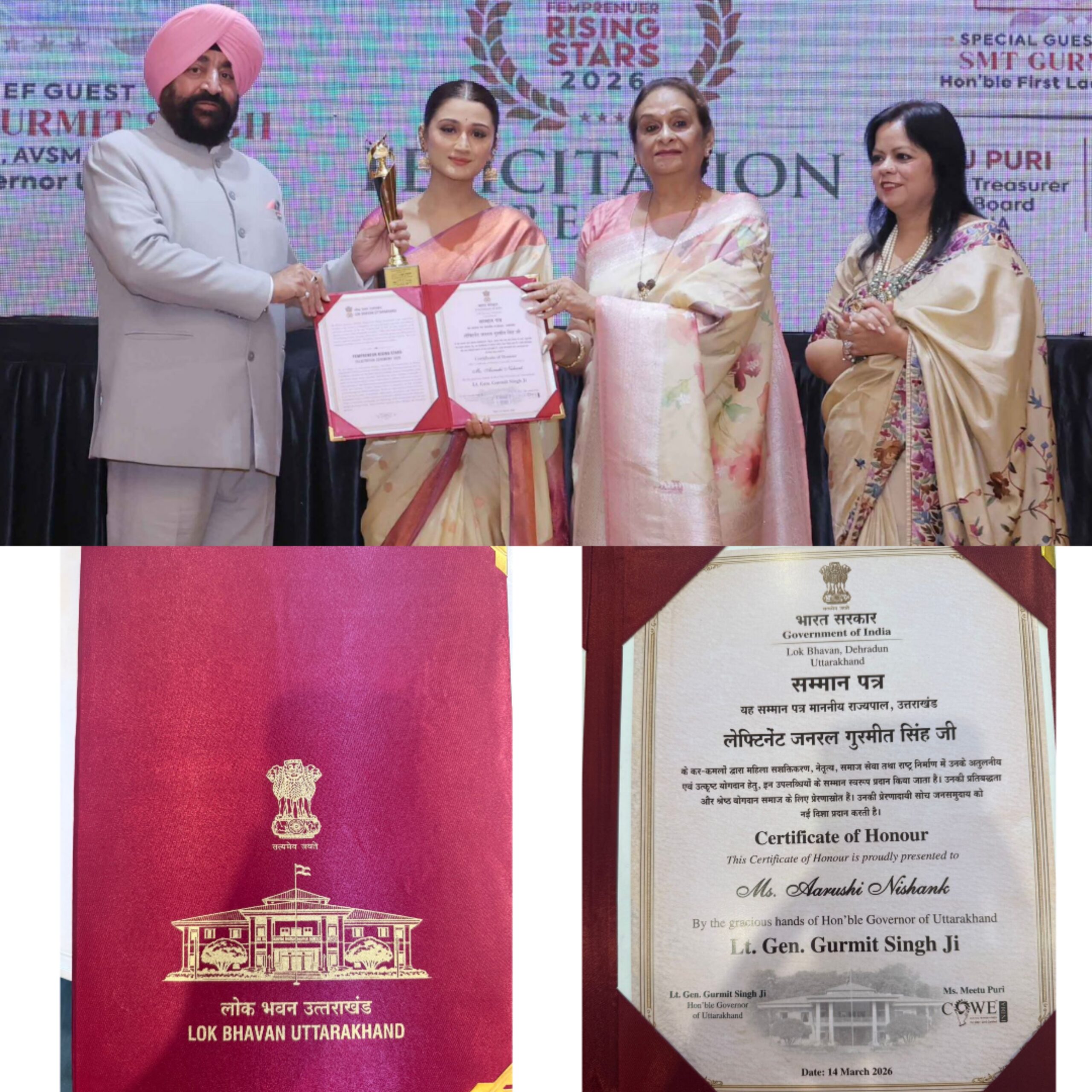अभिनेत्री, फिल्म निर्माता और प्रख्यात सामाजिक कार्यकर्ता डॉ. आरूषि निशंक को महिला सशक्तिकरण, सामाजिक नेतृत्व, पर्यावरण संरक्षण और राष्ट्र निर्माण में उनके उत्कृष्ट योगदान के लिए प्रतिष्ठित “वुमेन एक्सीलेंस अवॉर्ड्स – राइजिंग स्टार 2026” से सम्मानित किया गया। यह सम्मान उत्तराखंड के माननीय राज्यपाल लेफ्टिनेंट जनरल (Ret)गुरमीत सिंह द्वारा लोक भवन (राजभवन), देहरादून में आयोजित एक गरिमामयी समारोह में प्रदान किया गया। इस अवसर पर उत्तराखंड की प्रथम महिला श्रीमती गुरमीत कौर विशिष्ट अतिथि के तोर पे उपस्थित रहीं।