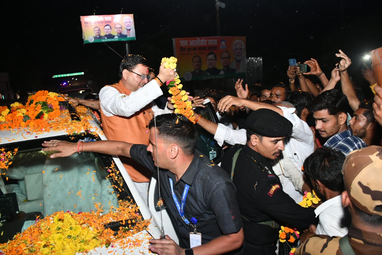से हुई पुष्प वर्षा, मंगलवार देर रात तक देखने को मिला धामी की लोकप्रियता का ग्राफ.. क्योंकि तस्वीर बोलती है , बोले धामी मध्यप्रदेश में जमकर हुआ विकास, फिर से बनने जा रही है डबल इजन की सरकार..