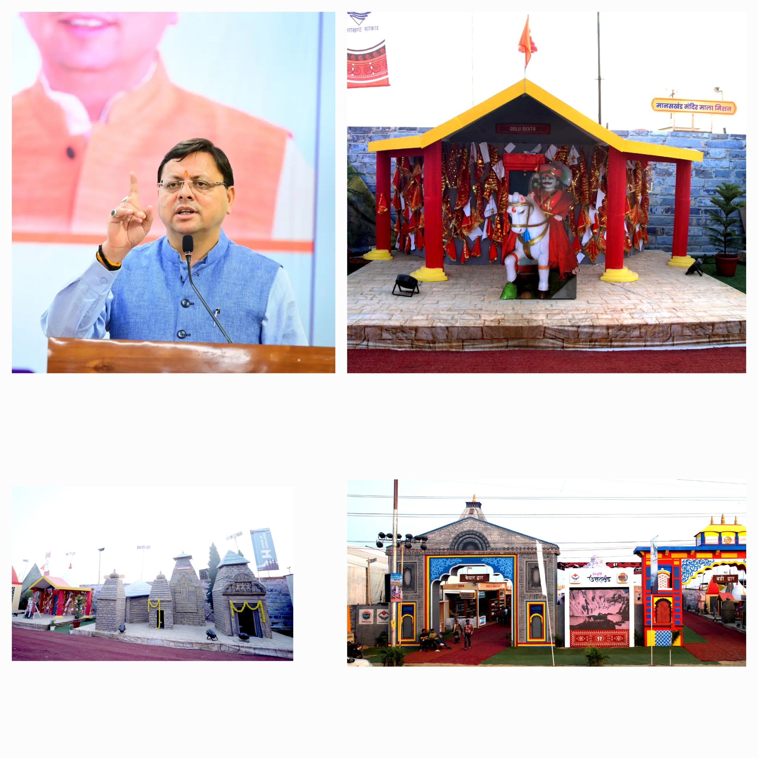 उन्होंने बताया कि उत्तराखण्ड मंडपम में प्रवेश द्वार के रूप में केदारनाथ द्वार एवं निकास द्वार के रूप में बद्रीनाथ द्वार निर्मित किया गया है। मंडपम के अंदर प्रवेश करने पर चारधाम- यमुनोत्री, गंगोत्री, केदारनाथ एवं बद्रीनाथ जी की दिव्य एवं भव्य प्रतिकृतियों के दर्शन होते हैं, इसके साथ ही हर की पैड़ी, हरिद्वार तथा गंगा की अविरल एवं पावन धारा के भी दर्शन होते हैं। मंडपम में दूसरी ओर माननीय मुख्यमंत्री जी की परिकल्पनाओं के अनुरूप शीतकालीन चारधाम तथा मानसखण्ड मंदिर माला के अंतर्गत श्री जागेश्वर धाम, श्री गोल्ज्यू देवता तथा नीम करोली बाबा की दिव्य प्रतिकृतियों को प्रदर्शित किया गया है।