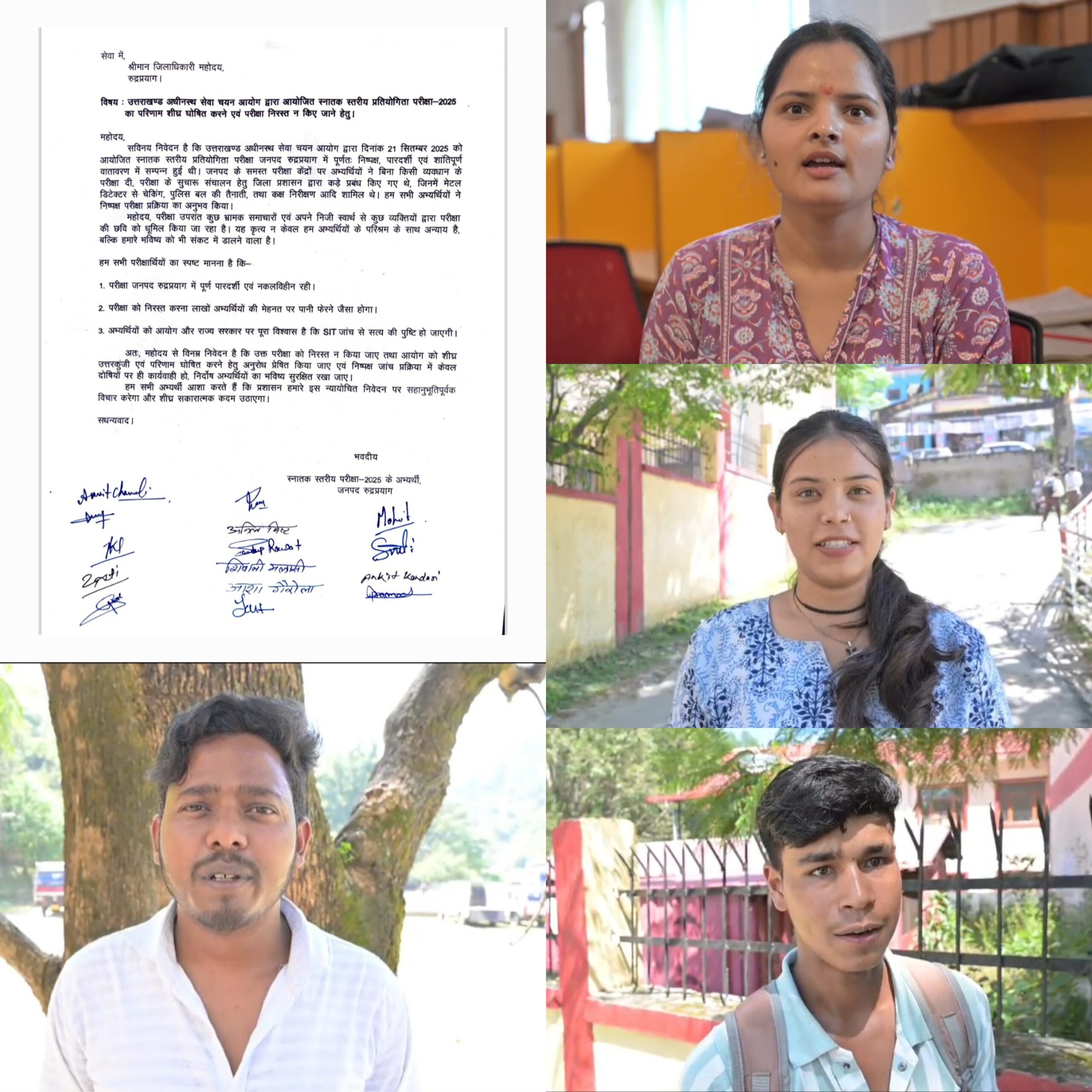 उत्तराखण्ड अधीनस्थ सेवा चयन आयोग द्वारा हाल ही में आयोजित की गई स्नातक स्तरीय परीक्षा में आयी शिकायतों के मध्यनजर इस परीक्षा में सम्मिलित जनपद रुद्रप्रयाग के प्रतिभागी परीक्षार्थियों द्वारा जिला अधिकारी रुद्रप्रयाग को सौंप कर उत्तराखण्ड अधीनस्थ सेवा चयन आयोग द्वारा आयोजित स्नातक स्तरीय प्रतियोगिता परीक्षा-2025 का परिणाम शीघ्र घोषित करने एवं परीक्षा निरस्त न किए जाने का अनुरोध किया है।