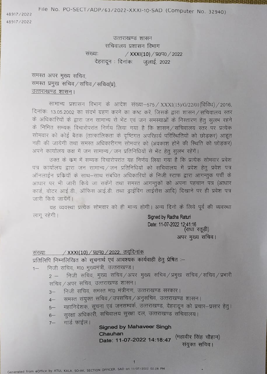 उत्तराखंड राज्य सचिवालय में अधिकारी अपरिहार्य स्थिति को छोड़कर सोमवार को कोई बैठक नहीं करेंगे। इस दिन वे सिर्फ जन प्रतिनिधियों व आम जन से मिलेंगे और उनकी समस्याएं सुनेंगे। इस एक दिन के लिए सचिवालय का प्रवेश पास बनाना भी कुछ आसान होगा।