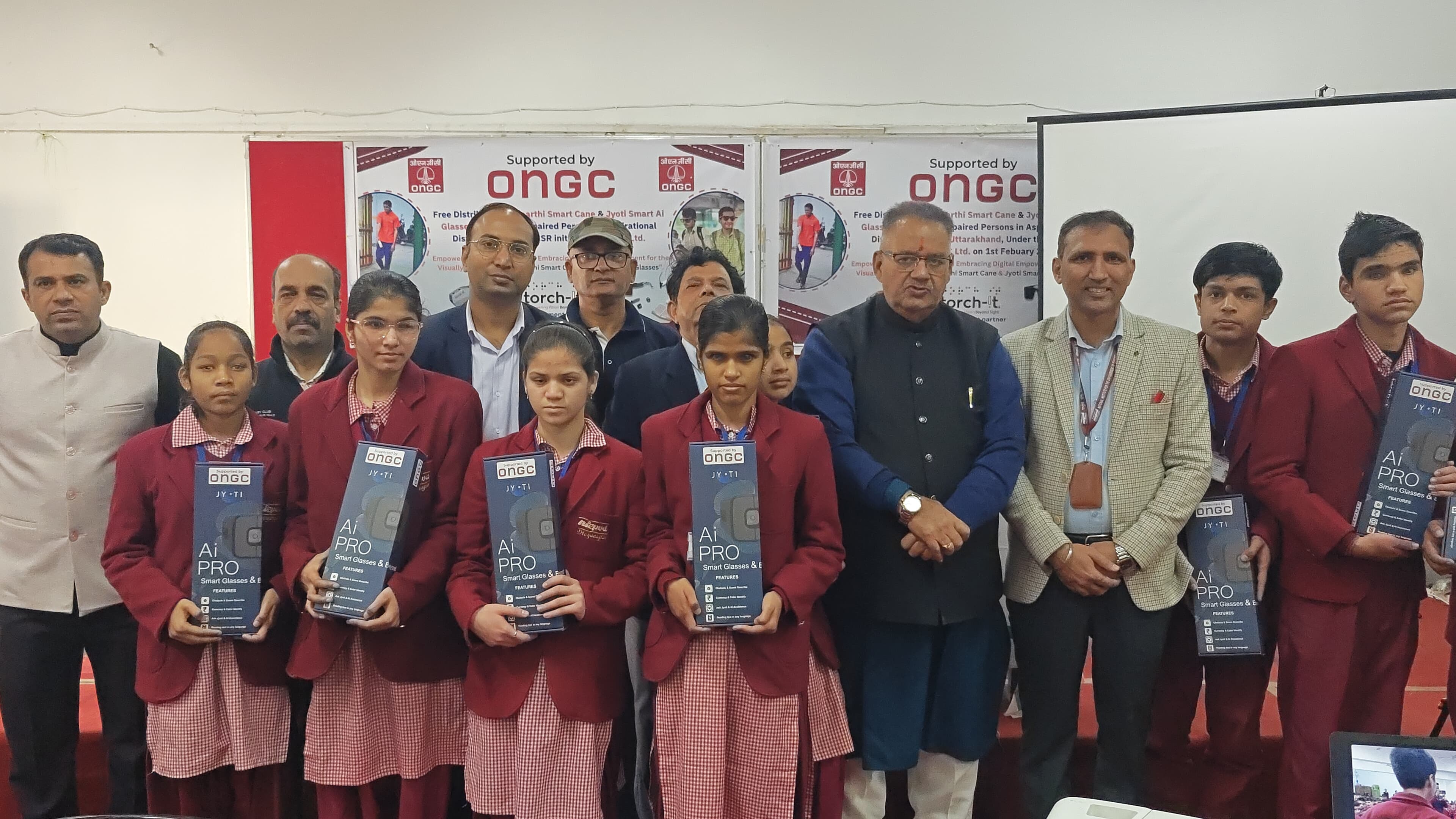 इस डिवाइस का वितरण गुजरात की एक कंपनी टॉर्च इट के द्वारा किया गया। टॉर्च किट के फाउंडर मिस्टर हनी भग्लानि जी एवं ओएनजीसी के सीएसआर हेड अरुण सिंह के द्वारा इस डिवाइस को आदर्श वि‌द्यालय के छात्र एवं छात्राओं हेतु उपलब्ध कराया गया। इस अवसर पर 120 ज्योति आई ग्लास दिव्यांग छात्र एवं छात्राओं को प्रदान किए गए और 190 सारथी स्मार्ट केन छात्र एवं छात्राओं को वितरित किए गए। यह एक ऐसी डिवाइस है जो की 80 से अधिक भाषाओं को ट्रांसलेट कर सकती है। इस डिवाइस के द्वारा दृष्टि दिव्यांग छात्र कलर और 300 विभिन्न प्रकार के ऑब्जेक्ट भी पहचान पाएंगे। इस डिवाइस के द्वारा प्रिंट में लिखा हुआ मटेरियल दृष्टि दिव्यांग अपने मोबाइल के दद्वारा पढ़ पाएंगे। इस डिवाइस में जीके के क्वेश्चन भी दिए गए हैं। यह डिवाइस छात्र एवं छात्राओं को उनके शैक्षणिक कार्यों में सपोर्ट हेतु और उनके सशक्तिकरण हेतु महत्वपूर्ण रोल निभाएगी।