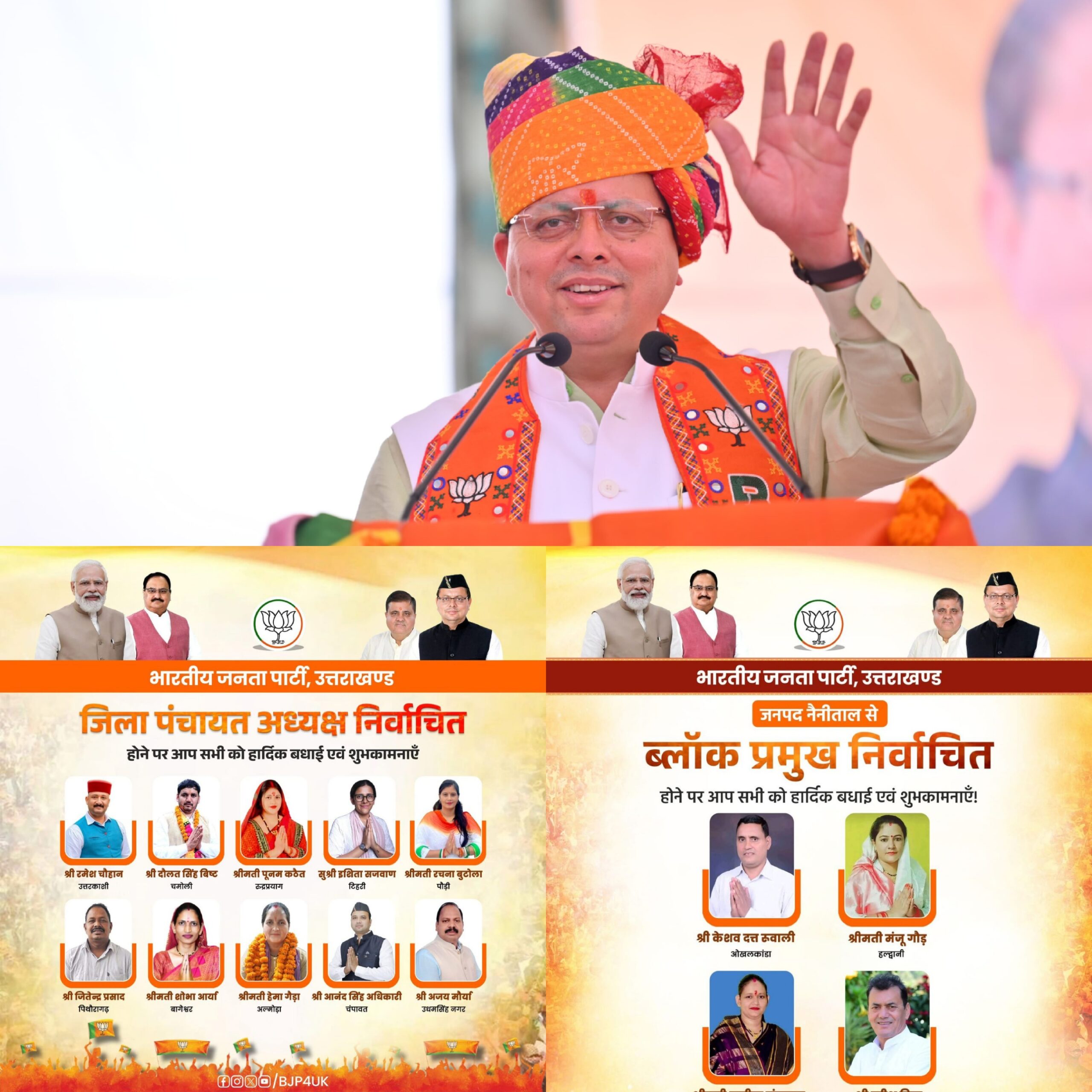श्री भट्ट ने कहा कि देवभूमि की जनता का विश्वास भाजपा के साथ है। यह प्रधान, जिला पंचायत सदस्य और क्षेत्र पंचायत सदस्य के परिणाम से साबित हो गया था। हमारे कार्यकर्ता 85 फ़ीसदी से अधिक प्रधान पदों पर निर्वाचित हुए हैं। इसी तरह ब्लॉक प्रमुख की 70 फ़ीसदी से अधिक सीटें भाजपा उम्मीदवारों ने जीती है। वहीं अब तक सामने आए 11 जिला पंचायत अध्यक्ष के नतीजे में 10 भाजपा के पक्ष में आए हैं।