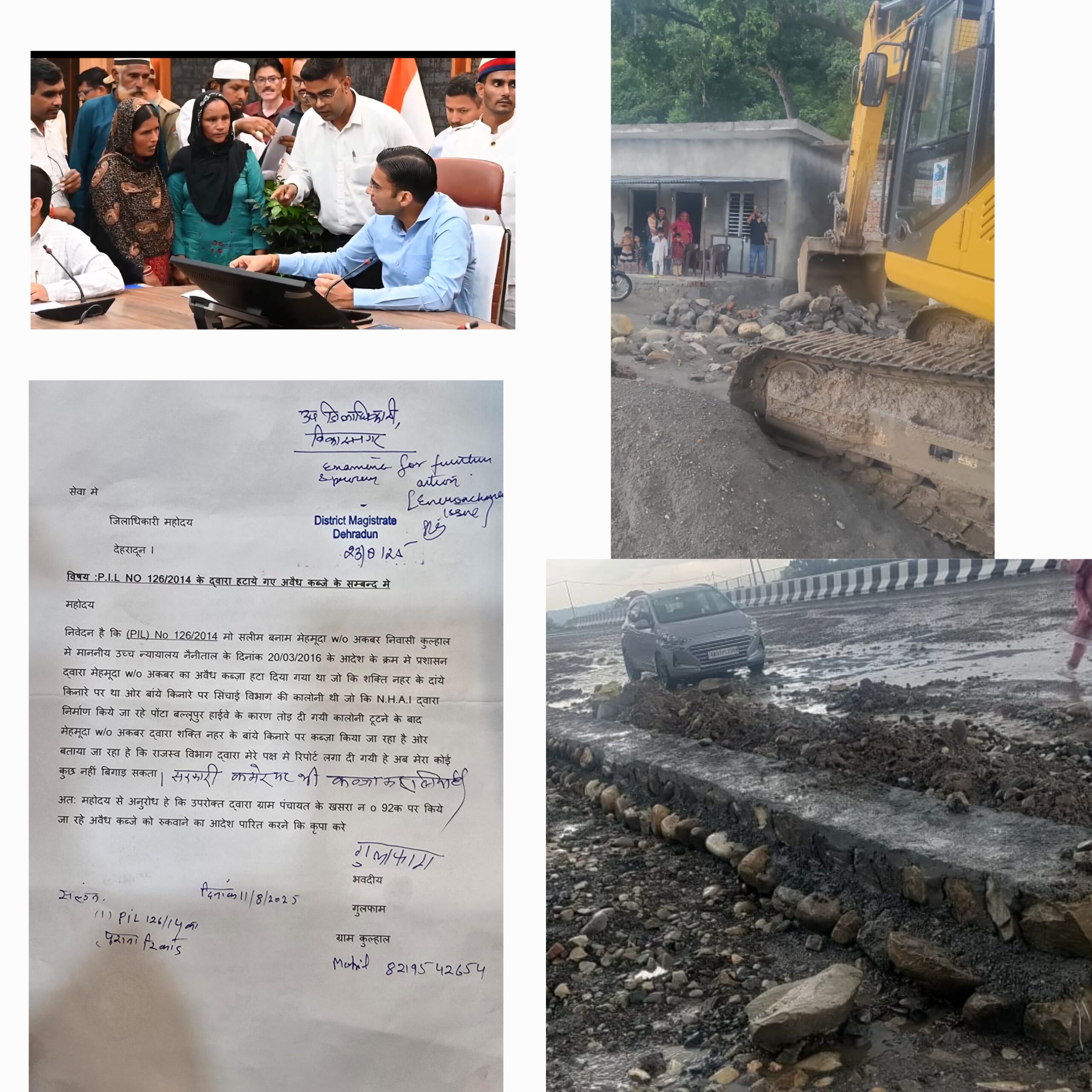 जनता दर्शन में कुल्हाल निवासी शिकायतकर्ताओं ने अपनी शिकायत में बताया कि शक्तिनहर के किनारे सिंचाई विभाग की कालोनी थी जिससे कब्जा प्रशासन द्वारा हटा दिया गया था एनएचआई द्वारा निमार्णाधीन सड़क किनारे अधिग्रहित भूमि पर अतिक्रमण कर कब्जा किया जा रहा है, जिस पर जिलाधिकारी ने तहसीलदार विकासनगर को त्वरित कार्यवाही के निर्देश दिए थे जिसके क्रम में जिला प्रशासन तहसील विकासनगर की टीम द्वारा अतिक्रमण पर ध्वस्तीकरण की कार्यवाही की गई है।
