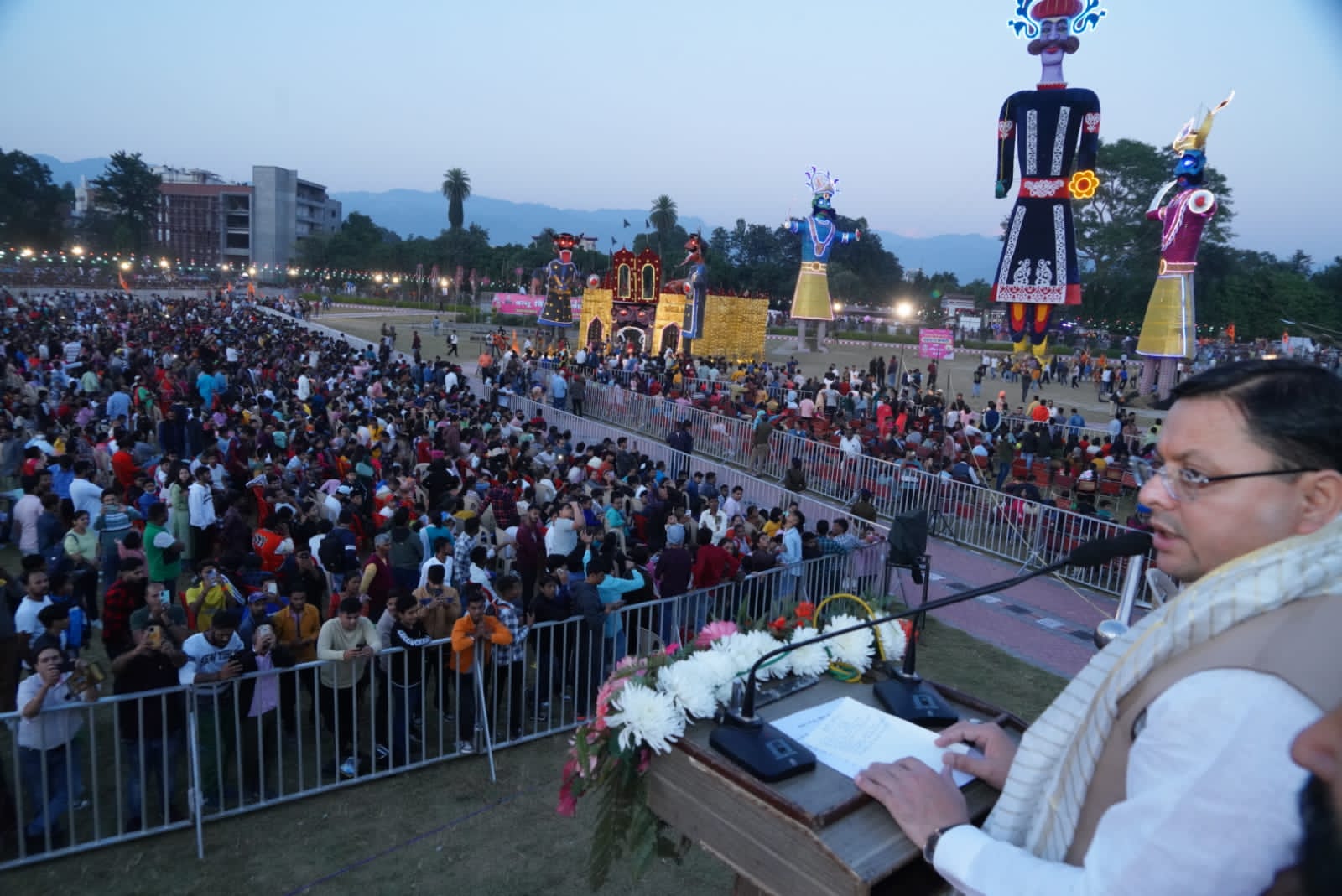 मुख्यमंत्री पुष्कर सिंह धामी मंगलवार को परेड ग्राउण्ड में बन्नू बिरादरी दशहरा कमेटी द्वारा आयोजित दशहरा महोत्सव में शामिल हुए। मुख्यमंत्री द्वारा इस अवसर पर भगवान श्री राम एवं हनुमान जी की पूजा अर्चना के तत्पश्चात् रावण, मेघनाथ और कुम्भकर्ण के पुतलों का दहन किया गया। मुख्यमंत्री ने सभी को विजयदशमी की शुभकामनाएं देते हुए कहा कि दशहरा का पर्व बुराई पर अच्छाई तथा अधर्म पर धर्म की विजय का प्रतीक है। उन्होंने कहा कि वर्षों से हम रावण का दहन करते आ रहे है। रावण अधर्म एवं बुराई का प्रतीक था, इसलिये उसे हर वर्ष जलना होता है। उन्होंने कहा कि यह अवसर हमें समाज में जहां भी बुराई नजर आती है उसे दूर करने का भी सन्देश देता है। अच्छा इंसान बनकर ही हम अच्छे समाज व देश के निर्माण में सहभागी बन सकते हैं। मुख्यमंत्री ने कहा कि विजयादशमी का यह पर्व हमारे समाज के लिये एक सीख और सामाजिक मूल्यों का प्रतिबिंब है। यह पर्व हमारे सामूहिक शक्ति को प्रदर्शित करने, हमारी सामाजिक जिम्मेदारियों के प्रति संवेदनशीलता बढ़ाने, और सामाजिक बुराइयों को दूर करने की दिशा में प्रयास करते रहने की परंपरा को आगे बढ़ाता है।
